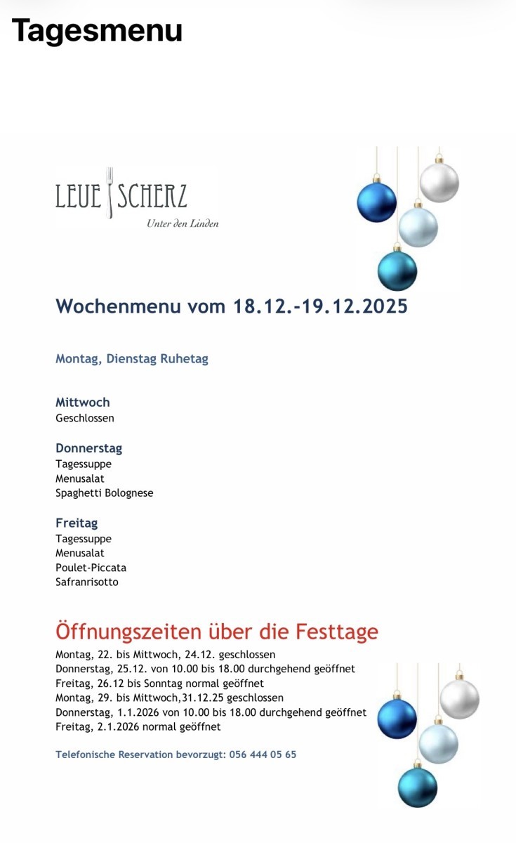 Lust auf eine festliche Gaumenfreude? 🎄✨ Schau dir unser Wochenmenu für den 18.12.-19.12.2025 an! Von Tagessuppe bis Poulet-Piccata – wir haben für jeden Geschmack etwas dabei. Diese Woche erfrischt mit kulinarischen Highlights. 🌟 Reserviere jetzt deine Plätze telefonisch und geniess unvergessliche Momente bei uns! 📞 #gourmetfreuden #festlichesessen #leuescherz #wochenmenü #kulinarik