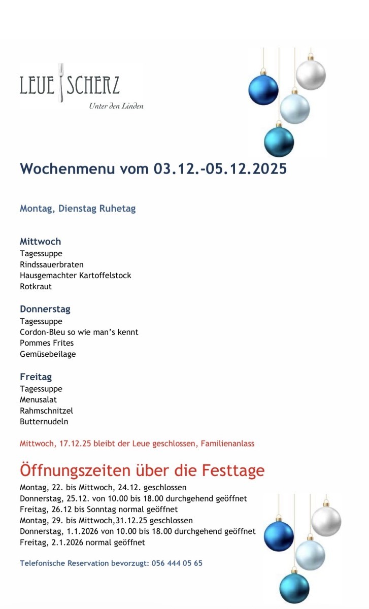 Entdecke festliche Gaumenfreuden bei Leue Scherz 🎄🍽️! Diese Woche erwarten dich delikate Highlights wie Rindssauerbraten und Rahmschnitzel, begleitet von hausgemachten Beilagen. 🥳 Verpasse nicht die besonderen Öffnungszeiten über die Festtage! Reserviere deinen Tisch jetzt telefonisch. ✨