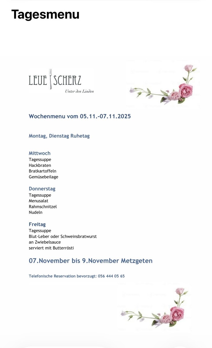 Entdecke unser verführerisches Wochenmenu im Leu Scherz! 🍽️ Von herzhaftem Hackbraten zu knusprigen Bratkartoffeln am Mittwoch, bis hin zu feinem Rahmschnitzel und Nüssli am Donnerstag. Der Freitag verwöhnt mit Blut-Leber oder Schweinsbratwurst an Zwiebelauce mit köstlichem Butterrösti. Das perfekte kulinarische Erlebnis erwartet dich! 🥘