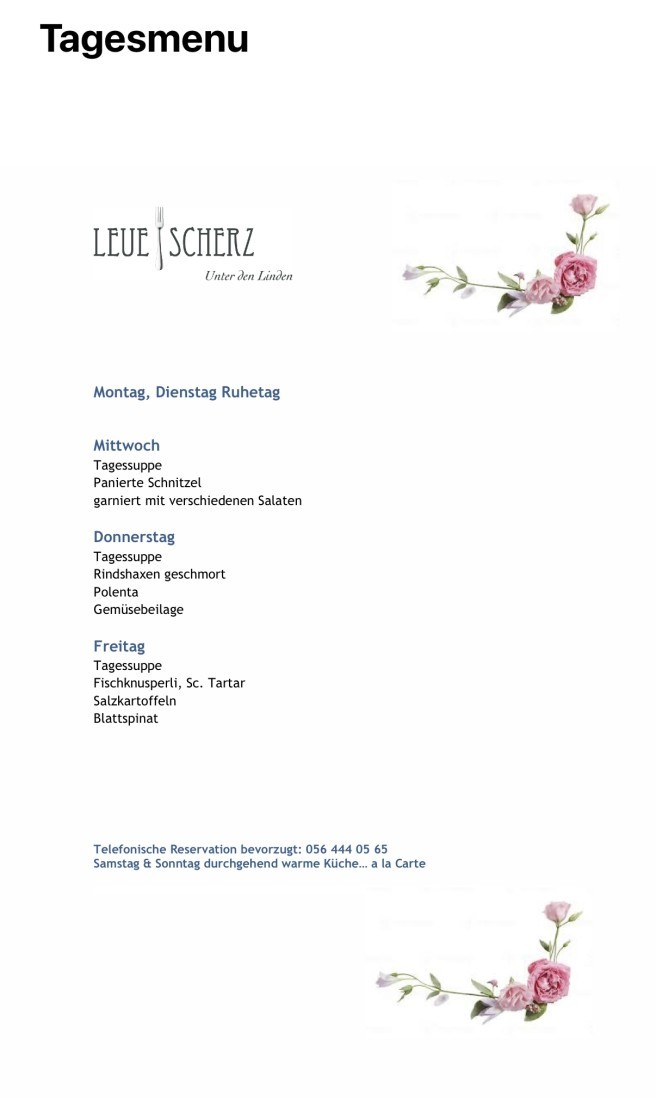 Lust auf kulinarische Leckerbissen? 🌸 Entdecke unser Tagesmenu im Leue Scherz! Diese Woche erwartet dich ein köstliches Angebot, das deinen Gaumen verzaubern wird: